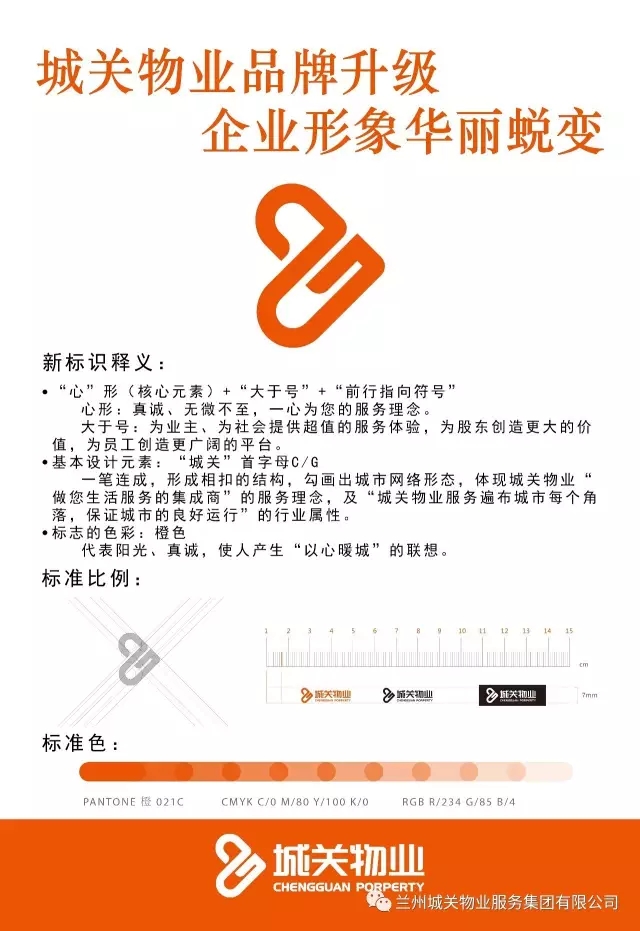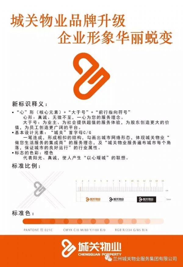 標識是企業(yè)品牌使用頻率最高的視覺(jué)符號,是形成品牌視覺(jué)形象的核心元素,還是品牌形象的象征與精神體現。城關(guān)物業(yè)服務(wù)集團新企業(yè)標識采用了橙色,代表陽(yáng)光、真誠,使人產(chǎn)生“以心暖城”的聯(lián)想。并將心形、大于號、前行指向符號作為核心設計元素集于一體。