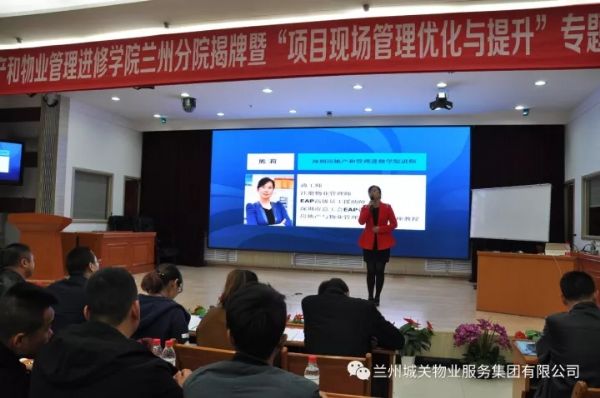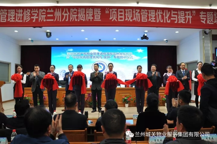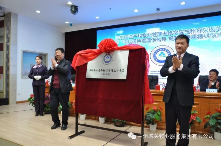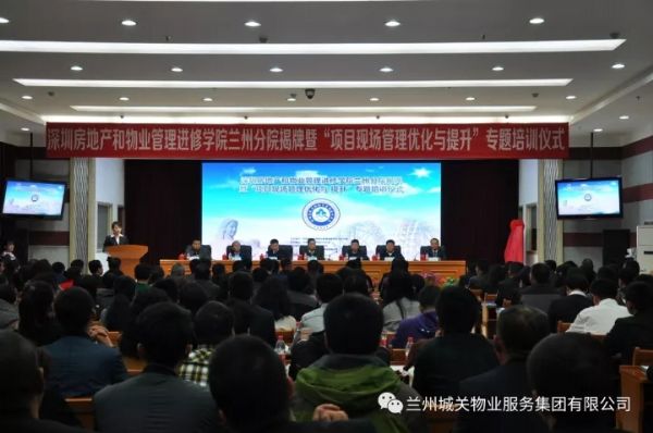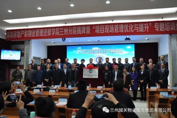 11月9日,深圳房地產(chǎn)和物業(yè)管理進(jìn)修學(xué)院蘭州分院揭牌暨“項目現場(chǎng)管理優(yōu)化與提升”專(zhuān)題培訓儀式在蘭州新聞出版大廈七樓多功能廳舉辦。蘭州市人力資源和社會(huì )保障局、蘭州市住房保障和房產(chǎn)管理局、蘭州市商務(wù)局等單位的領(lǐng)導及深圳房地產(chǎn)和物業(yè)管理進(jìn)修學(xué)院院長(cháng)劉業(yè)全、蘭州城關(guān)物業(yè)服務(wù)集團有限公司董事長(cháng)楊民召、甘肅新華飛天物業(yè)管理有限公司總經(jīng)理張建國等相關(guān)企業(yè)代表300余人出席了揭牌儀式。