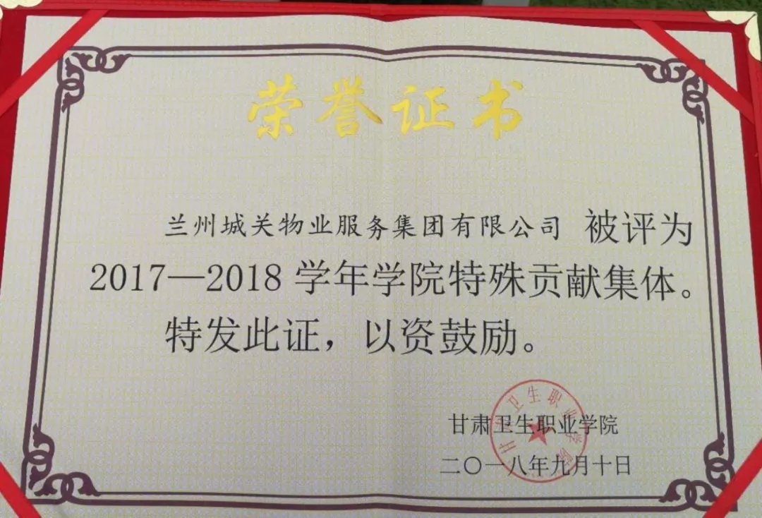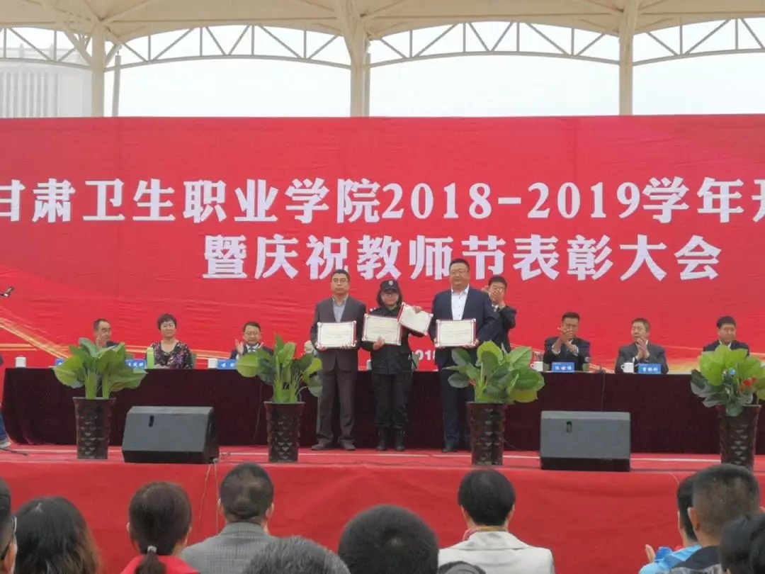 甘肅衛生職業(yè)學(xué)院召開(kāi)2018-2019學(xué)年開(kāi)學(xué)典禮暨教師節表彰大會(huì )。城關(guān)物業(yè)服務(wù)集團被評為2017-2018年學(xué)院特殊貢獻集體獎。