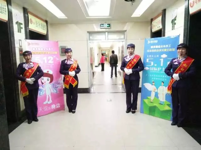 城關(guān)物業(yè)醫院類(lèi)各項目部在護士節當天,在醫院各主要入口處擺放節日祝福展架,并向來(lái)往的醫護人員行禮,向他們送去節日的祝福。