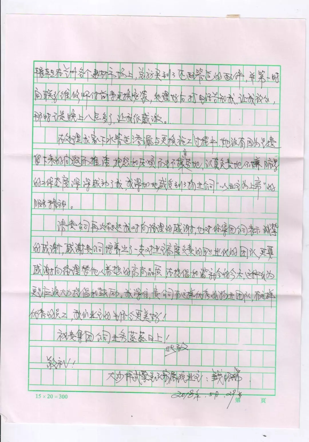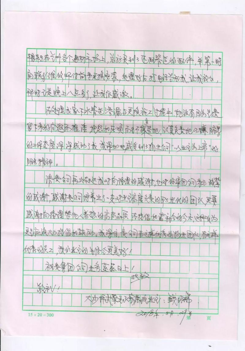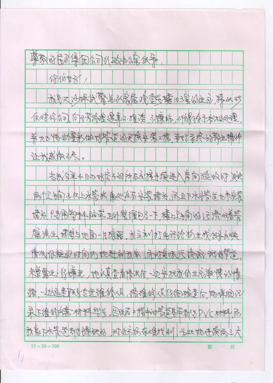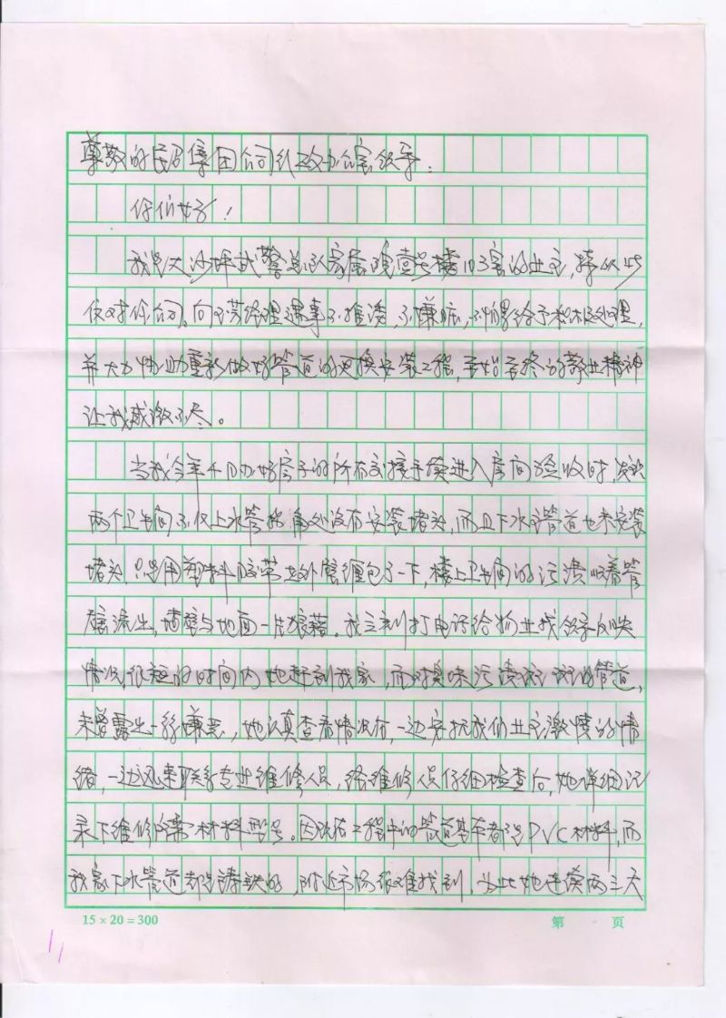 在為錢(qián)先生解決下水管道滲漏問(wèn)題及安裝更換的過(guò)程中,向玉芳經(jīng)理沒(méi)有一絲推諉,沒(méi)有一句抱怨,不嫌臟亂、認真負責的工作態(tài)度得到了業(yè)主的肯定和贊譽(yù)。業(yè)主錢(qián)先生特意寫(xiě)來(lái)感謝信,以此來(lái)表達對向玉芳經(jīng)理的感激之情,及對城關(guān)物業(yè)服務(wù)工作的肯定和贊揚。