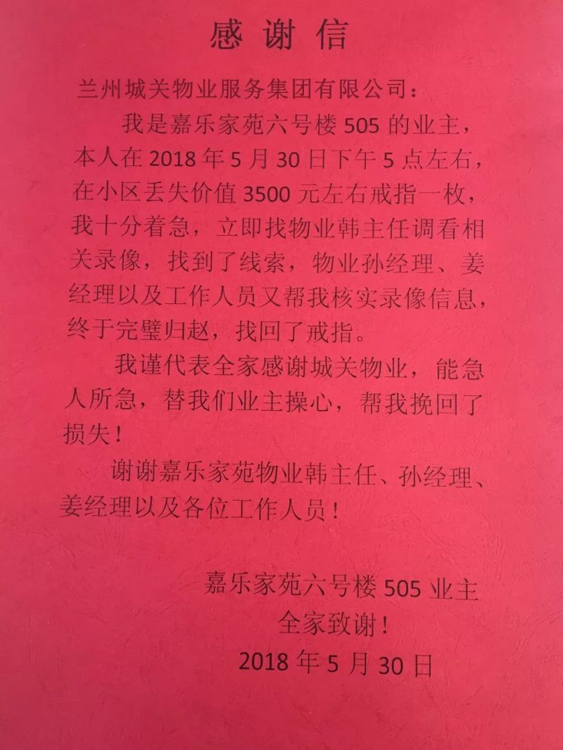 家住嘉樂(lè )家苑6號樓505的業(yè)主林女士,不慎將一枚戒指遺失在小區內。丟失了戒指的林女士萬(wàn)分著(zhù)急,來(lái)到物業(yè)服務(wù)中心尋求幫助。城關(guān)物業(yè)嘉樂(lè )家苑項目部經(jīng)理韓元春得知情況后,立刻調閱查看當天監控視頻,經(jīng)過(guò)仔細排查后找到了相關(guān)線(xiàn)索,并順利尋回失物,及時(shí)挽回了業(yè)主的財產(chǎn)損失?吹浇渲竿觇禋w趙后的李女士感激萬(wàn)分,特將感謝信送至公司,以此表達對城關(guān)物業(yè)的贊揚。
