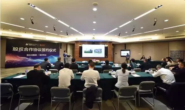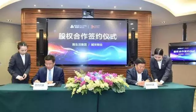 城關(guān)物業(yè)董事長(cháng)楊民召(右)與雅生活集團總裁劉德明(左)簽署股權合作協(xié)議