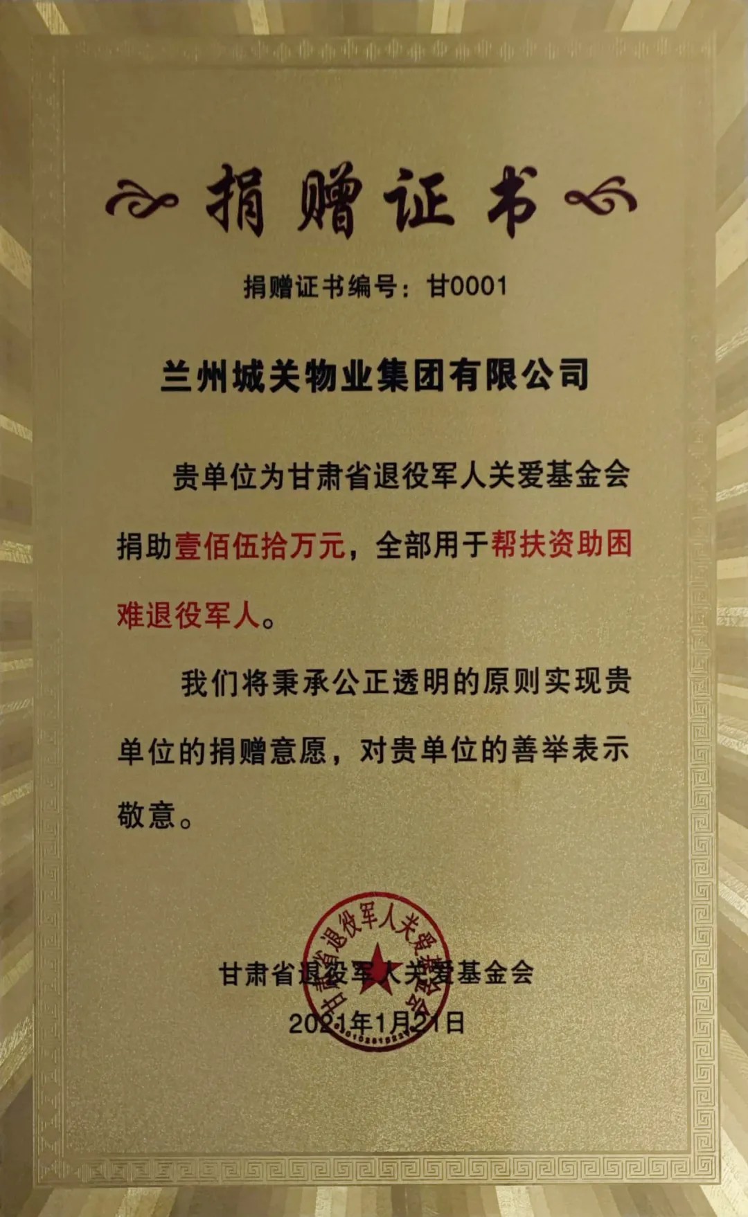 蘭州城關(guān)物業(yè)服務(wù)集團有限公司積極支持國防和軍隊建設,襄助退役軍人扶危濟困事業(yè),向甘肅省退役軍人關(guān)愛(ài)基金捐助150萬(wàn)元善款,以實(shí)際行動(dòng)為幫助退役軍人就業(yè)、解決退役軍人生產(chǎn)生活困難、加強軍政軍民團結工作貢獻力量、“錦上添花”。